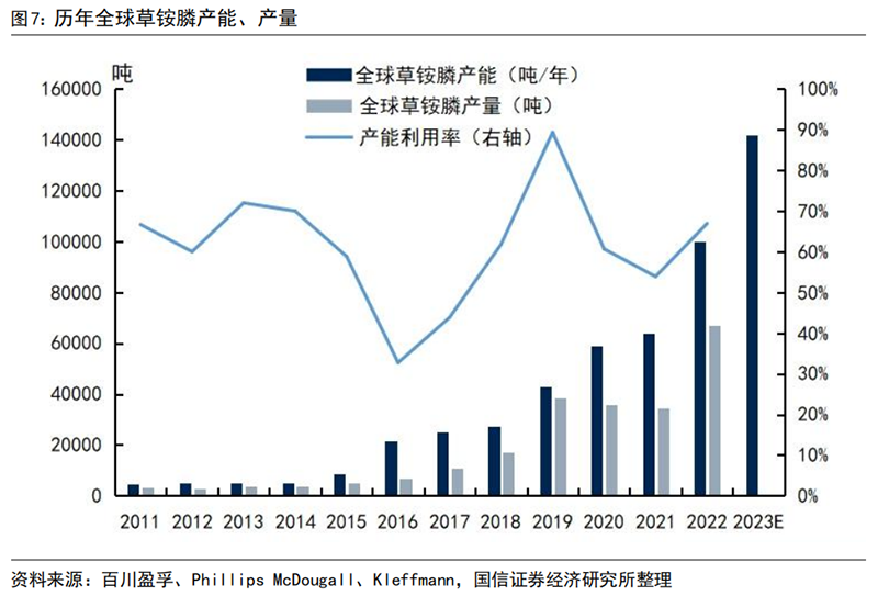 受讓部分百草枯禁限用退出的市場。百草枯價格低廉,對惡性闊葉雜草特效,除草更徹底,且雜草沒有抗藥性、對環境友好,但其對人毒性較大,無特效解毒劑。2017 年以前,我國每年使用百草枯水劑超過 10 萬噸,2016 年 7 月 1 日起國內百草枯水劑已停止使用,百草枯產品只能用于出口,不得在境內銷售。根據 PhillipsMcDougall 統計,2018 年全球百草枯使用量達到 7.9 萬噸,全球市場銷售額達12.02 億美元,2020 年已降至 8.5 億美元。百草枯的單位用量約為草甘膦的 1/3,草銨膦的 4/5,敵草快的 2/3,但百草枯的持效期較短,因此施用頻率比草甘膦、草銨膦等除草劑要高,假設百草枯的施藥頻率為其他除草劑的 2 倍,考慮到迄今為止沒有一種除草劑可以完全替代百草枯,假設百草枯退出的市場缺口被草甘膦、草銨膦、敵草快按 4:4:2 的比例承接,則其他除草劑新增需求量大致等于百草枯被禁限用的量。而根據利爾化學 2023 年定增公告,隨著國際禁限用的擴大,巴西、中國、泰國、馬來西亞、越南等國家都開始禁用百草枯,全球累計禁用達到 2.6萬噸左右,這為其他非選擇性除草劑帶來約 2.6-3 萬噸的需求增量。我們假設約4 成百草枯退出的市場被草銨膦承接,則該部分對應約 1-1.2 萬噸/年的草銨膦需求量。