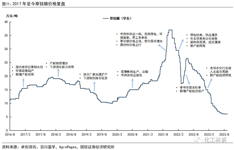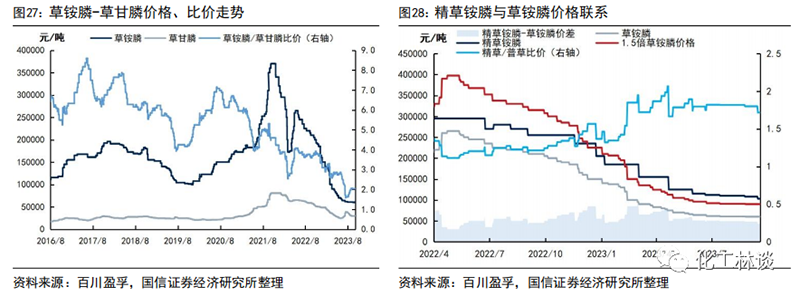 總的來說,草銨膦綜合除草效果優異,可以在很多場景中實現對其他除草劑的部分替代,而且隨著價格下行,恢復性價比的草銨膦部分替代其他除草劑的進程有望加快。