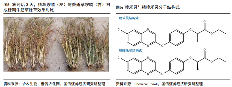 從除草劑的發展歷史來看,我們認為當前精草銨膦與二十年前精喹禾靈的市場環境相似,精喹禾靈(R 體)是在合成喹禾靈的過程中去除了非活性的光學異構體(L 體)后的改良制品,作用機制和殺草譜與喹禾靈相似,但作用速度更快、藥效翻倍、用量減半。2000 年之前我國只能生產普通喹禾靈,在南開大學攻克精喹禾靈的生產工藝后,精喹禾靈憑借性能及性價比優勢迅速實現了對喹禾靈的升級替代,目前國內市場上很少有普通喹禾靈藥品銷售。