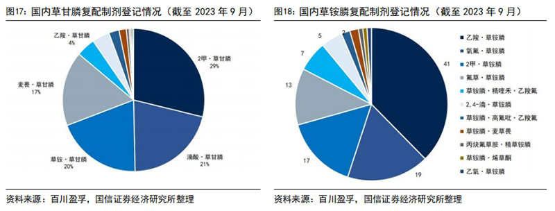 與草甘膦及其他除草劑的復配使用打開草銨膦需求增長空間。目前全球有超 200種雜草生物型對 26 種已知作用機理除草劑類型中的 23 類產生了抗藥性。草甘膦作為全球第一大除草劑,使用時間超 50 年,1996 年以來全球范圍內抗草甘膦雜草的報道頻率逐年增加,據世界除草劑抗性行動委員會統計,目前全球已有超 50種農田雜草對草甘膦產生了抗藥性。從農業實踐看,草甘膦和草銨膦復配對部分耐草甘膦的惡性雜草如牛筋草、小飛蓬等除草效果較好,可以起到解決抗藥性、擴大殺草譜的效果,使得兩種除草劑在性能上實現互補。據中國農藥信息網,截至 2023 年 9 月,國內共有 59 個草銨·草甘膦復配產品登記,在所有與草甘膦復配的品種中排名第三。除與草甘膦復配外,草銨膦還可以與乙羧氟草醚、高效氟吡甲禾靈、丙炔氟草胺、敵草隆、西瑪津和 2 甲 4 氯等多種除草劑進行配伍,可以起到提高防治范圍、顯著延長持效期、擴大殺草譜、提高環境兼容性等作用。