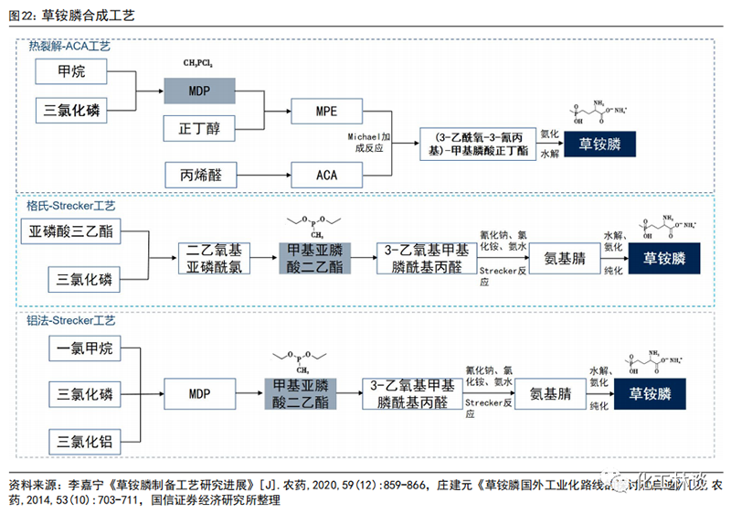 草銨膦生產工藝壁壘較高,目前全球草銨膦主要有 3 種產業化生產路線:熱裂解-ACA 工藝、鋁法-Strecker 工藝、格氏-Strecker 工藝。理論上,草銨膦可經由化學合成法和生物發酵法提取,目前各種合成方法各有優劣,但總體都面臨反應條件要求高、工藝復雜、過程控制難度大、成本較高等問題,目前國內僅有少部分公司的能實現規模化穩定生產。當前,全球草銨膦的生產工藝包括熱裂解-ACA工藝、鋁法-Strecker 工藝和格氏-Strecker 工藝三種,三種方法有其相似之處,但在原材料成本、過程損耗、反應機理、環保友好性和收率等方面區別較大。