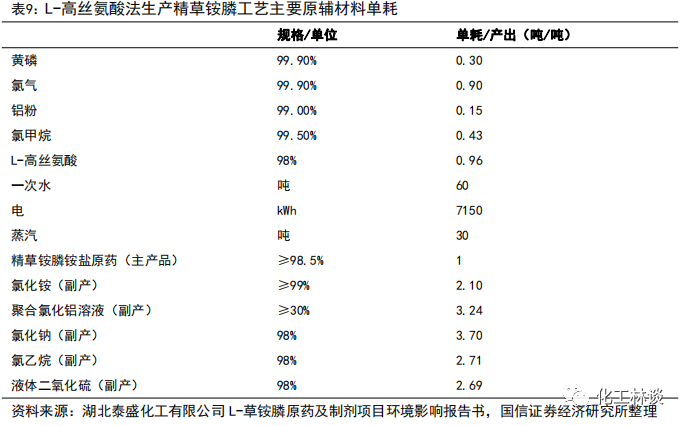 L-高絲氨酸法的關鍵在于 L-高絲氨酸、中間體的穩定供應,技術成熟后成本優勢將逐漸顯現。根據泰盛化工、匯盟生物等公司的相關項目環評公告及百川盈孚、wind 等平臺提供的相關原輔材料價格信息,我們測算出以葡萄糖為原料使用生物發酵法生產 L-高絲氨酸的主要原輔材料成本約 1.1 萬元/噸。同時,根據湖北泰盛化工有限公司 L-草銨膦原藥及制劑項目環境影響報告書中 L-草銨膦的物料平衡表,剔除掉溶劑等重復使用的物料,我們測算出理論上 L-高絲氨酸法生產精草銨膦的主要原輔材料成本約 7-8 萬元/噸,而 L-高絲氨酸工藝的副產品如果全部外售也可帶來 1-2 萬元/噸的收入,沖抵部分生產成本。目前國內 L-高絲氨酸法精草銨膦尚實現工業化生產,原因在于 L-高絲氨酸和中間體的供應不穩定以及工藝不夠成熟,我們認為未來工藝成熟后 L-高絲氨酸法的成本優勢將逐漸顯現。